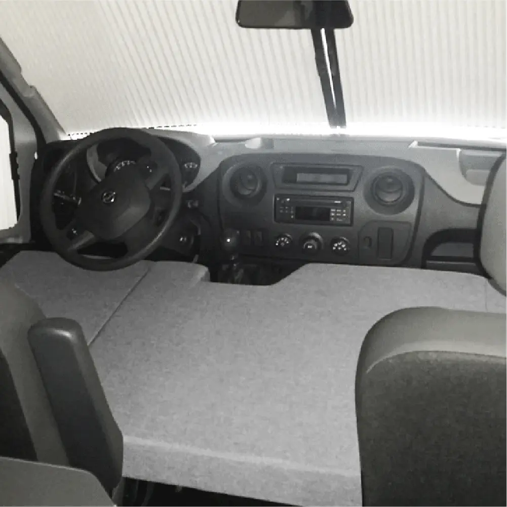 basta aprire il materasso nella parte anteriore del tuo furgone, posizionarlo contro il cruscotto, quindi far avanzare i sedili per mantenerlo ben fermo in posizione.
