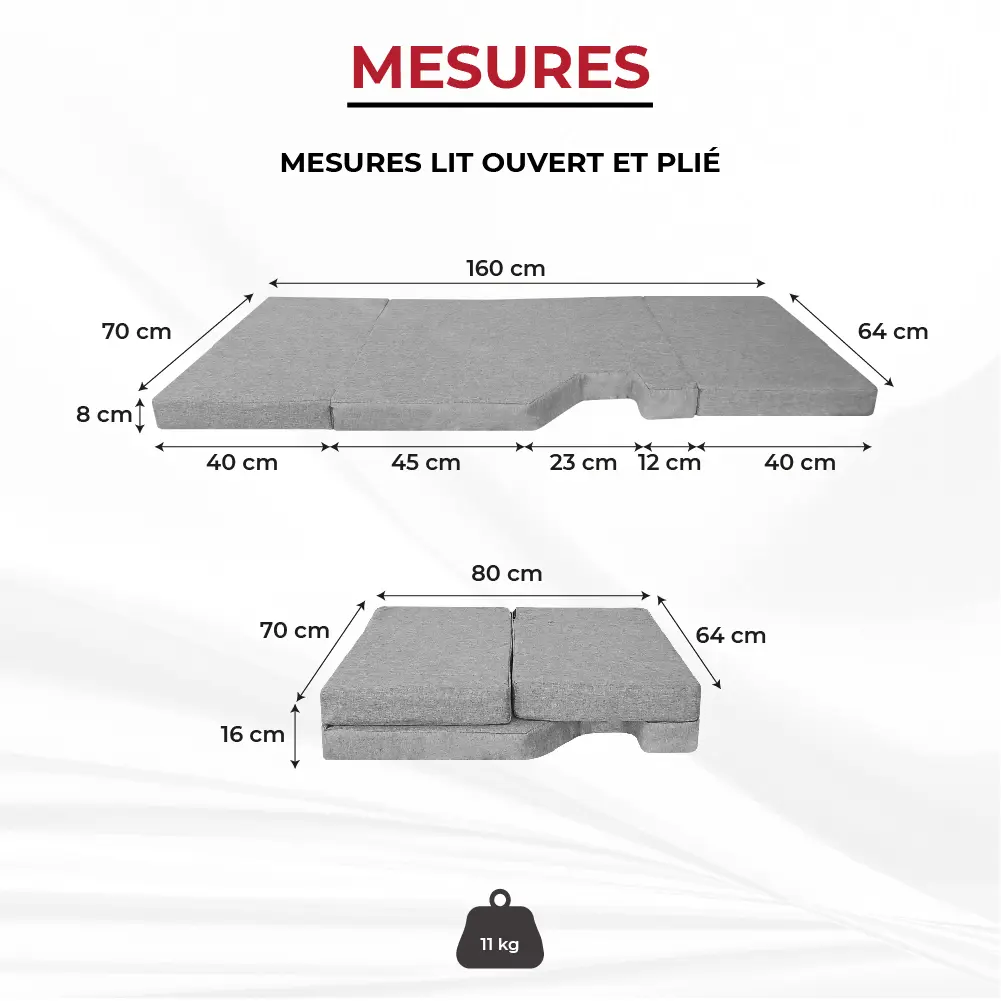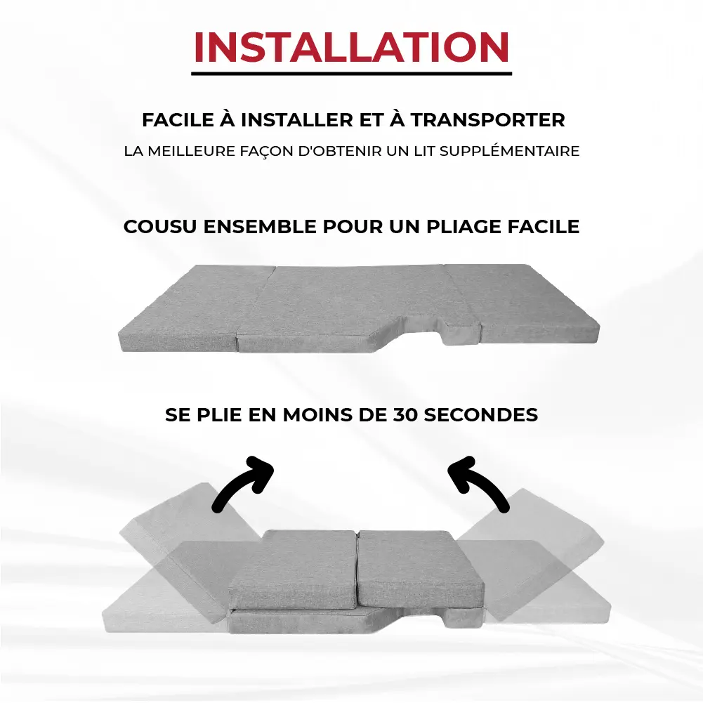 Diviso in tre sezioni, il materasso si piega facilmente per un risparmio di spazio massimo. Il formato compatto consente di riporlo nel bagagliaio o sotto il letto principale quando non viene utilizzato, ideale per ottimizzare ogni centimetro del tuo camper o furgone.