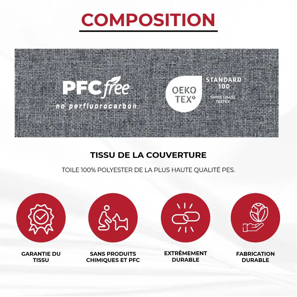 Tessuto 100% poliestere, sfoderabile e lavabile in lavatrice