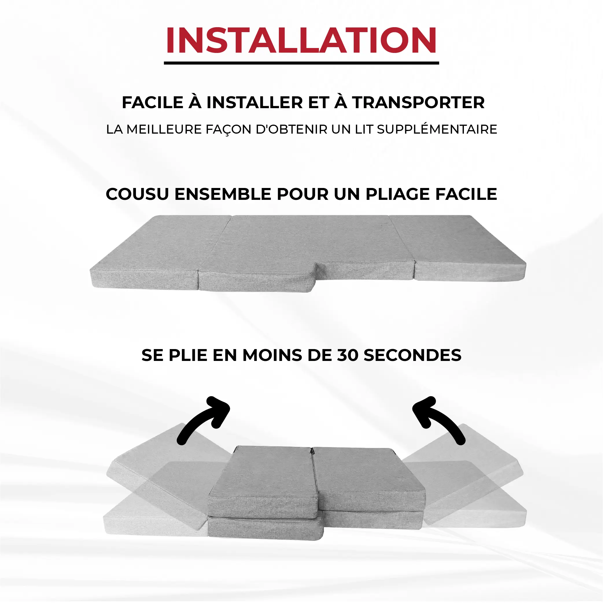 Le matelas se compose de trois parties reliées, ce qui permet de le plier rapidement et de le transporter sans encombre.