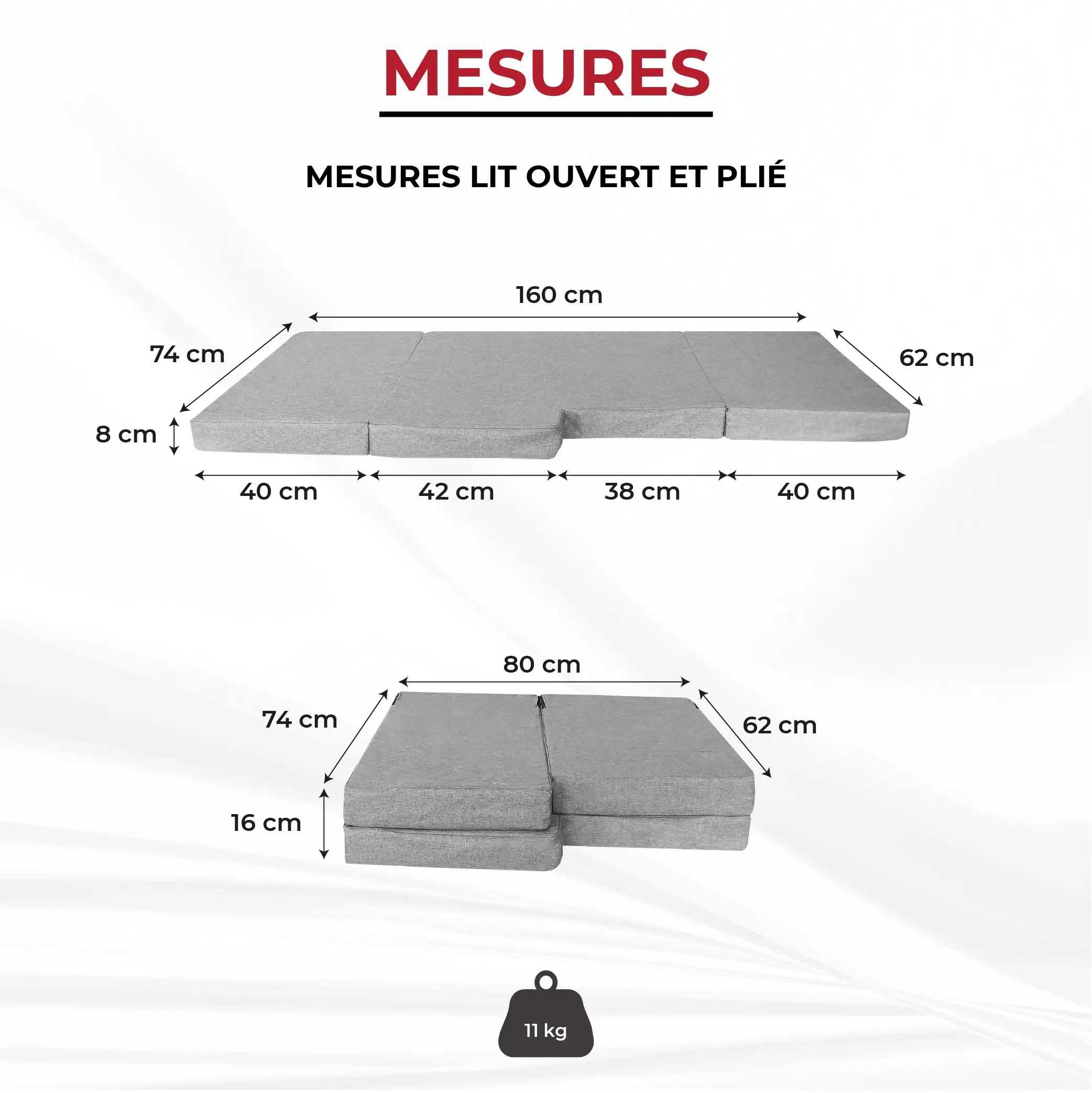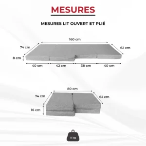 Déplié : 160 × 74 × 8 cm